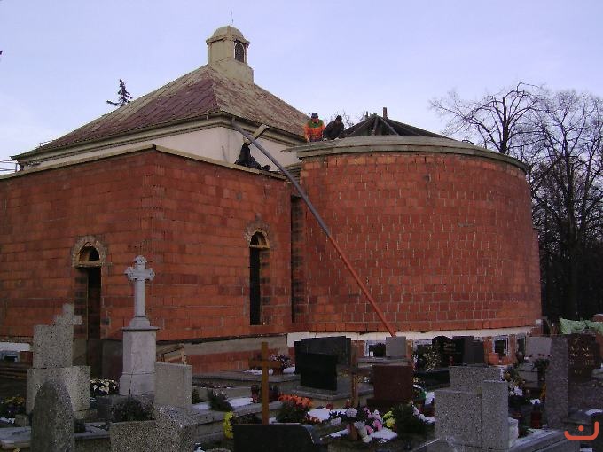 Rosną mury kaplicy bocznej Zejście do kaplicy w przyziemiu Okna kaplicy w przyziemiu Dach nad kaplicą boczną Wnęka w kaplicy bocznej Konstrukcja nośna dachu prezbiterium Prace przy dachu nad prezbiterium Powstaje konstrukcja dachu Dach nad prezbiterium